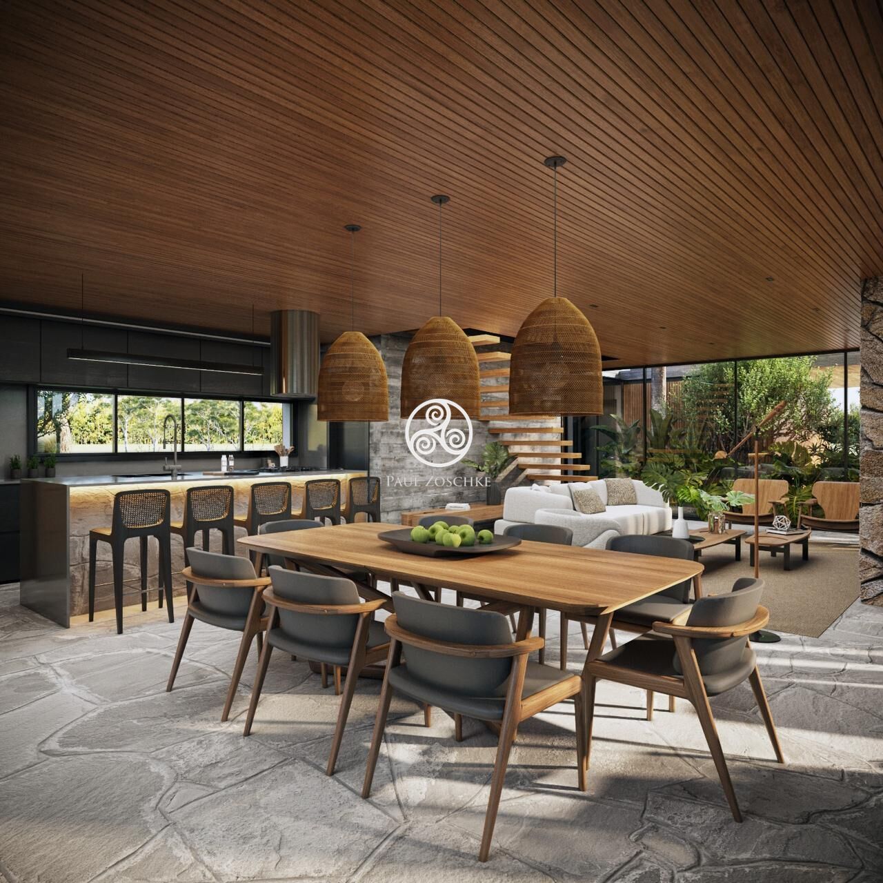 A área social é complementada por lavabo, banheiro externo, depósito, lavanderia e uma cozinha gourmet com ilha central e despensa.