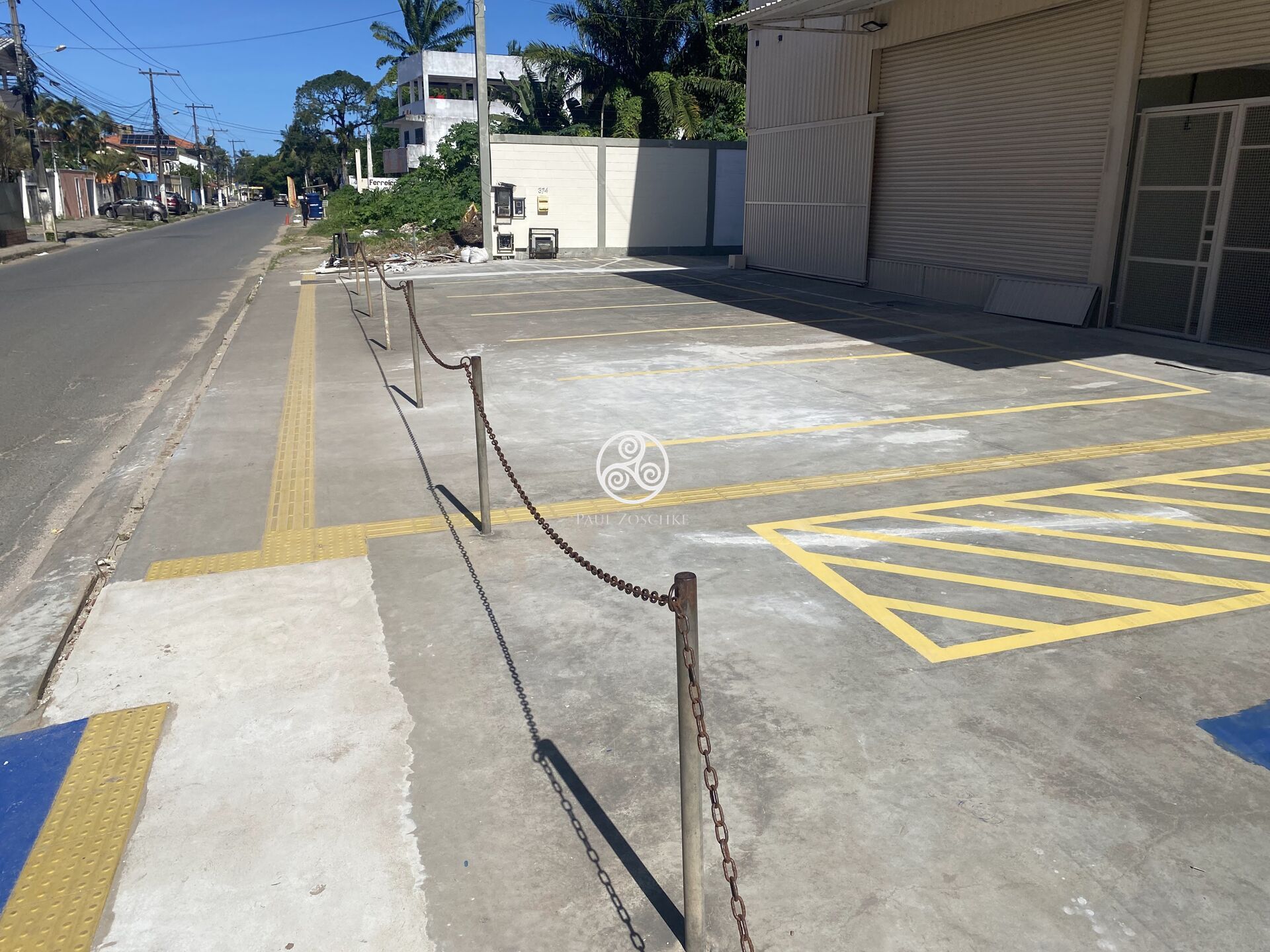 hidrantes com mangueiras, luzes de emergência, caixa d'água subterrânea para alimentação dos hidrantes