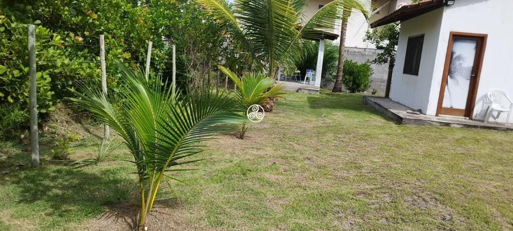 (conhecido como Aibim) passando ao fundo. Com terreno gramado, possui coqueiros, romãs plantados e cajueiros nativos,
